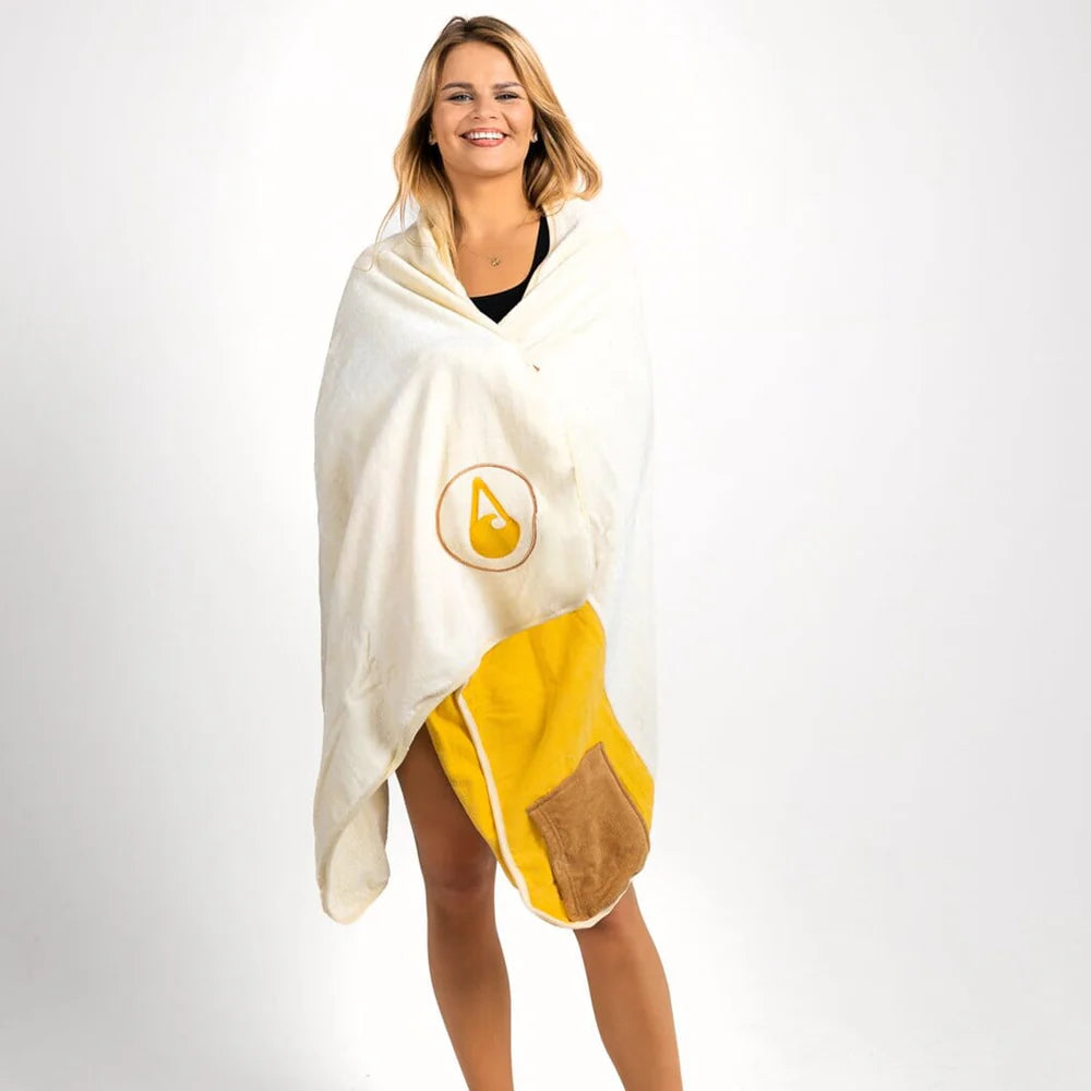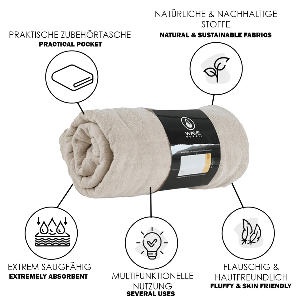 Badetuch mit Kopfkissenfach und Zubehörtasche für dein Handy, Schlüssel und/ oder Portemonnaie.