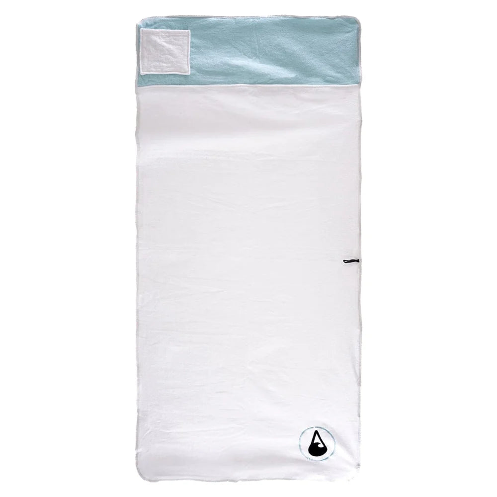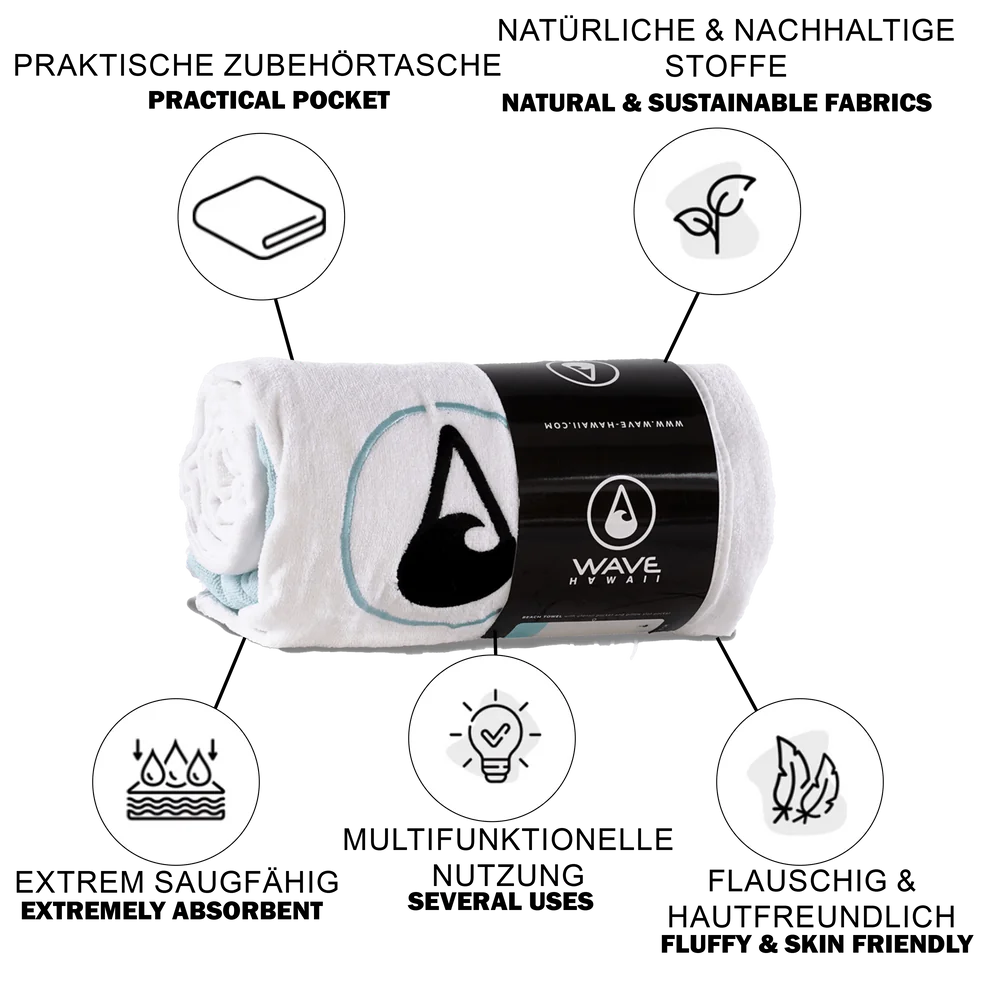 Badetuch mit Kopfkissenfach und Zubehörtasche für dein Handy, Schlüssel und/ oder Portemonnaie.