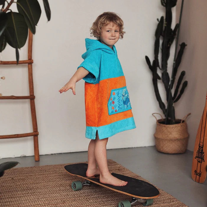 Gemütlicher Poncho für unsere Kleinsten in Größe XXS aus super hautfreundlicher und 100% natürlicher Baumwolle. Mit hoher Wasserabsorption, so dass die nasse Kinderhaut schnell trocken ist. Zweilagige, besonders warme Kapuze mit hohem Kragen. Die große Fronttasche mit Platz für Shampoo, Bürste und die kalten Kinderhände. Ein echter Hingucker. Die sorgsam ausgesuchten Stoffe sind angenehm weich und hautfreundlich, aber sehr robust.