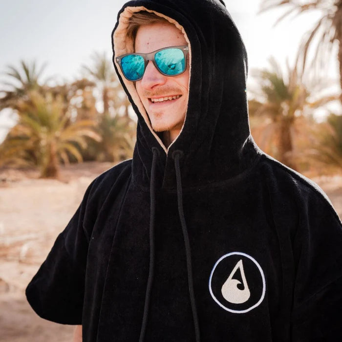Gemütlicher Poncho in den Größen M und XL aus super hautfreundlicher und 100% natürlicher Baumwolle, Öko Tex Standard 100 zertifiziert. Mit hoher Wasserabsorption, so dass nasse Haut schnell trocknet. Außen weiches und robustes Velours, innen angenehmes und saugfähiges Frottee. Zweilagige, besonders warme Kapuze mit hohem Kragen und Kordel. Die große Fronttasche mit Platz für Shampoo, Bürste und die kalten Hände. Ein echter Hingucker.